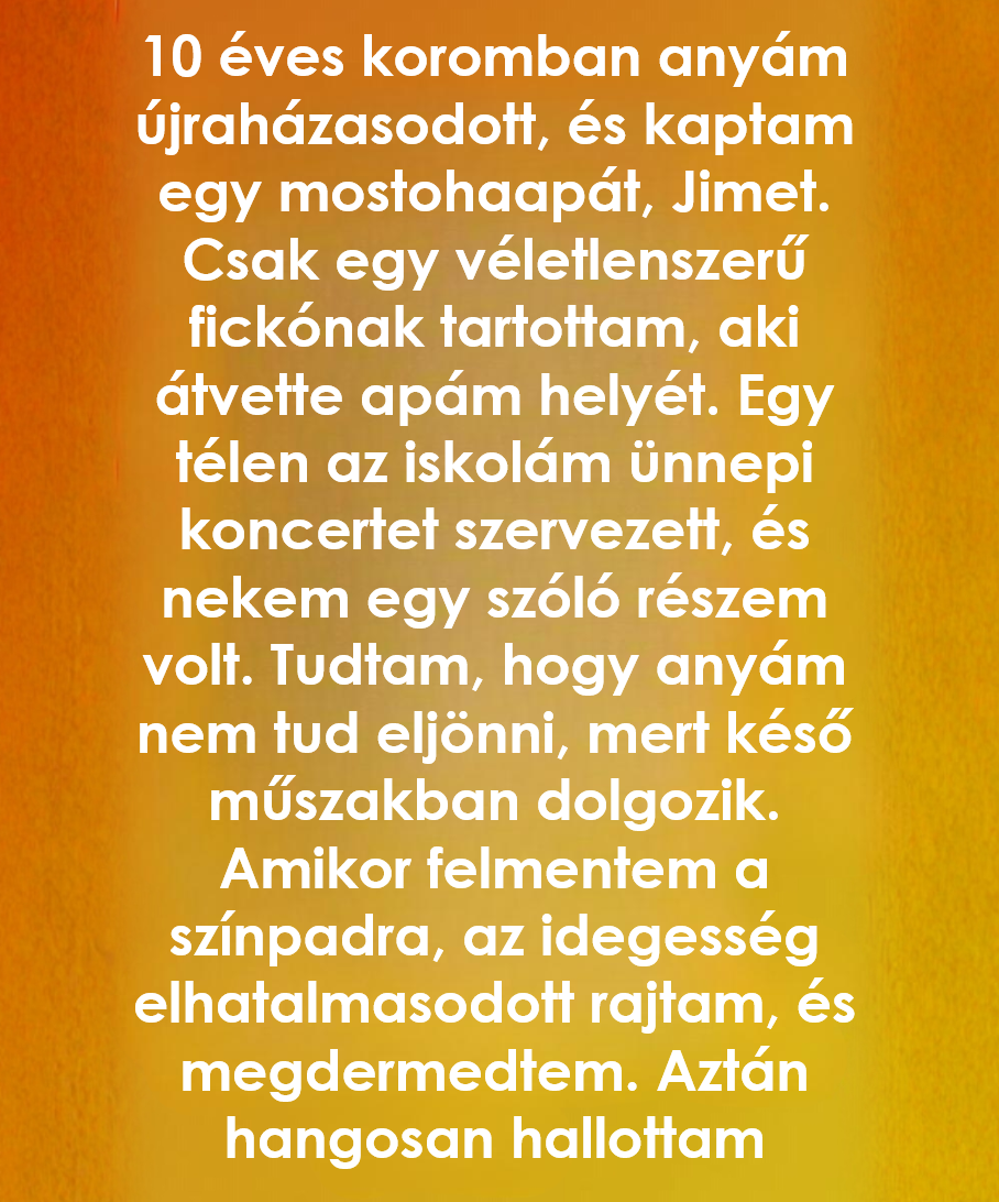 Anyukám a munkája miatt nem tudott eljönni, így teljesen egyedül léptem fel a fényes színpadra. Reszketett a kezem, elcsuklott a hangom, és egy pillanatra lefagytam.