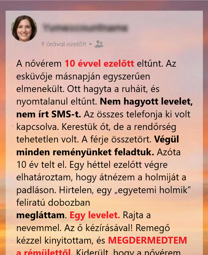 A nővérem tíz évvel ezelőtt tűnt el. Az esküvője utáni reggelen egyszerűen nyoma veszett. A ruhái ott maradtak, nem hagyott üzenetet, magyarázatot sem. Az összes telefonja ki volt kapcsolva. Mindent átkutattunk, de a rendőrség semmire sem jutott. A férje összetört. Ahogy telt az idő, a remény lassan elhalványult. Tíz év telt el teljes csendben.