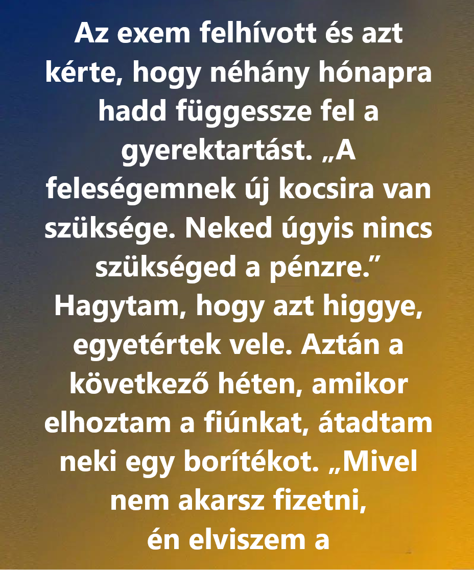 Egy hónappal később a szokottnál korábban érkezett a fiunkért. A kezében egy boríték volt. Benne a teljes, elmaradt gyerektartás, és mellé csatolta a bankszámlakivonatot, ami bizonyította, hogy beállította az automatikus utalást, „hogy ne csússzak meg megint”.