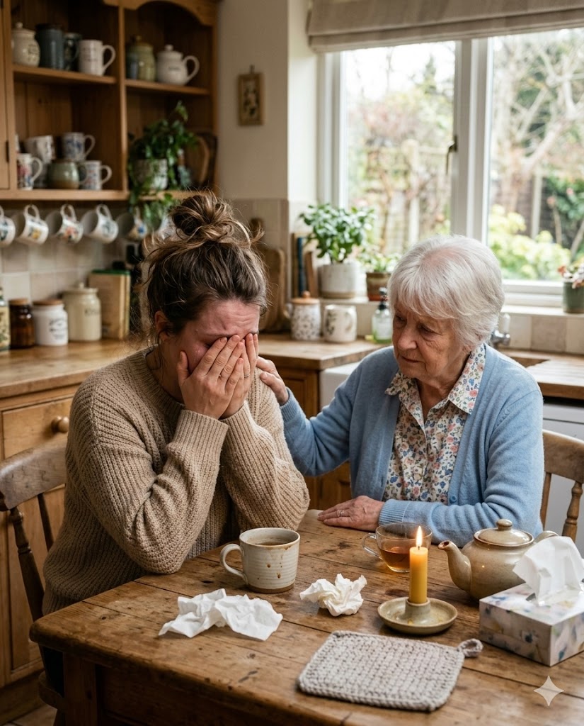 Bent minden illat ugyanaz volt, mint régen: meleg fa, szárított fűszerek, tea. Olyan volt, mint egy biztos hely. Leültem a konyhaasztalhoz, ő pedig forró vizet töltött két bögrébe. Közben annyira remegett a kezem, hogy rá kellett szorítanom a csészére.