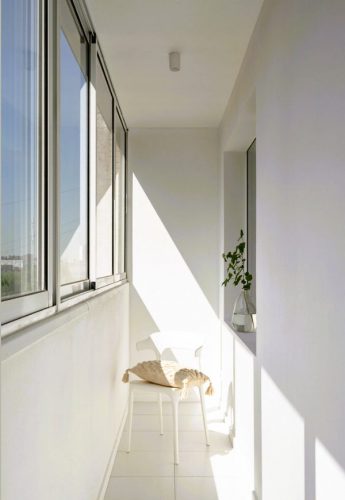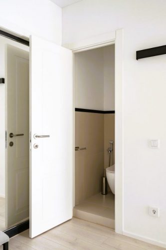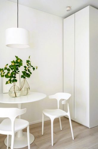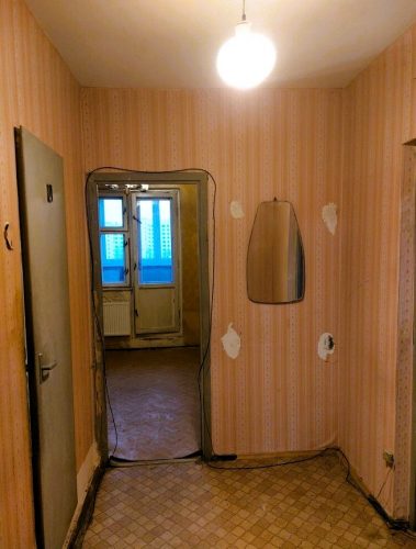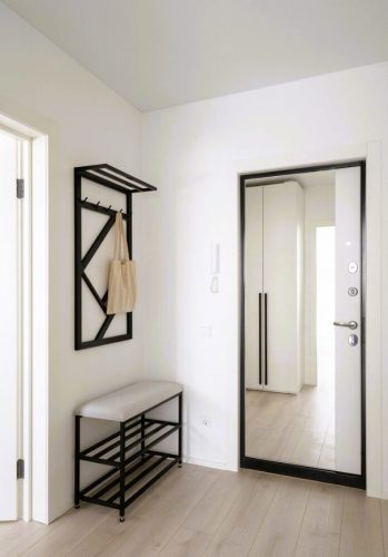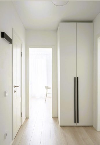 Az egész szoba színpalettáját világos színek díszítették. A padlón világos laminált padló, a falak fehér festékkel vannak borítva. Az új bejárati ajtó beépített tükörrel van felszerelve.