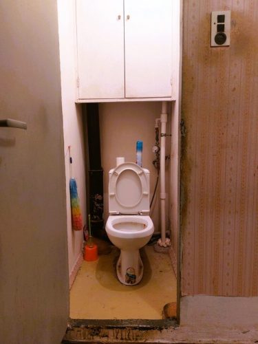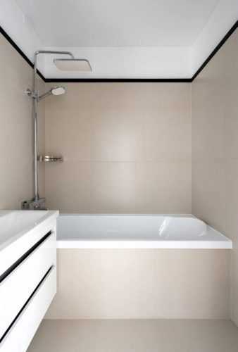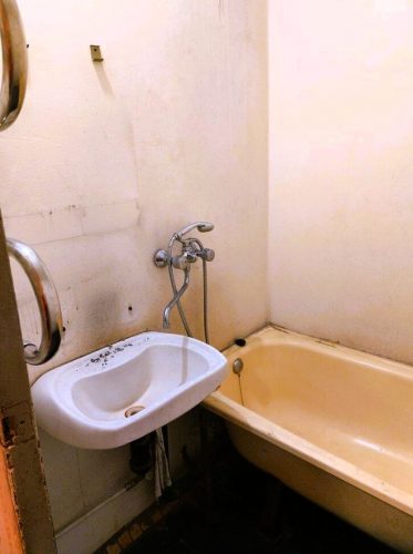 A fürdőszobában a vízvezeték a helye maradt, csak a mosdó előtt lett kialakítva egy hely mosógép beépítésére, ami később kerül beépítésre.