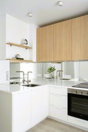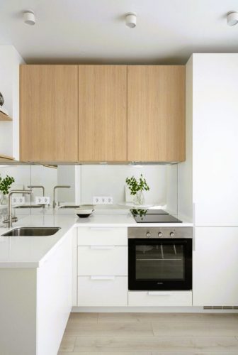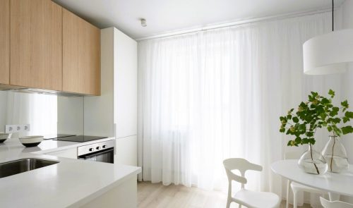 A konyha kialakítása illeszkedik a lakás általános stílusához: ugyanazok az anyagok a padlóhoz és a falakhoz. A bejárattól balra egy egyedi formájú, egyedi formájú konyhagarnitúra található.