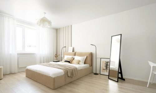 Az ablak mellett egy bézs árnyalatú franciaágy található, puha fejtámlával. A fej falát dekoratív panelek díszítik. Az ablak mellett egy minimalista fésülködőasztal, nagy tükörrel.