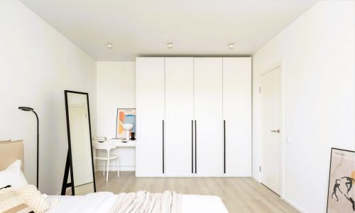 A jobb oldalon egy nyitott fekete ruhaakasztó található, amely alatt kényelmesen található egy puha pad cipőrekesszel. A konyha és a főszoba közötti térben egy tágas fehér szekrény található elegáns fekete fogantyúkkal.