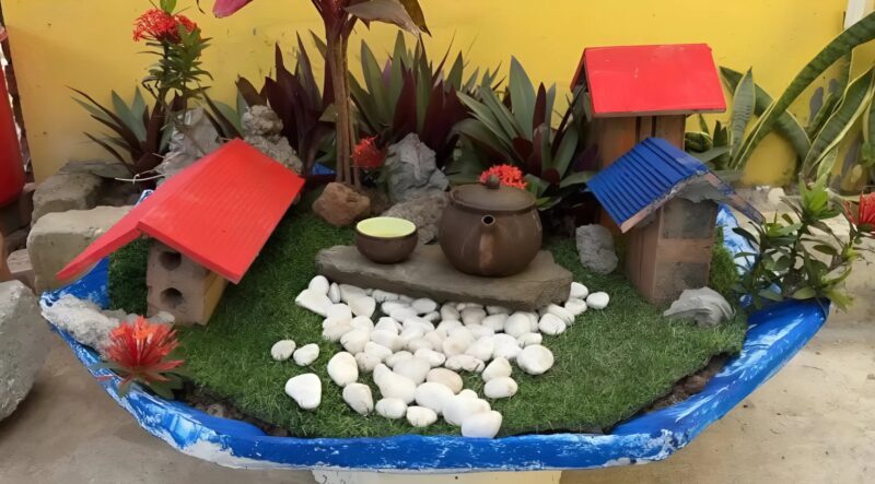 A kész műalkotást használhatod egy eredeti virágágyásként — csak adj hozzá földet és ültess virágokat. Vagy hagyhatod dekorációs elemként, kiegészítve kövekkel, mozaikkal, mintákkal, vagy akár LED világítással.