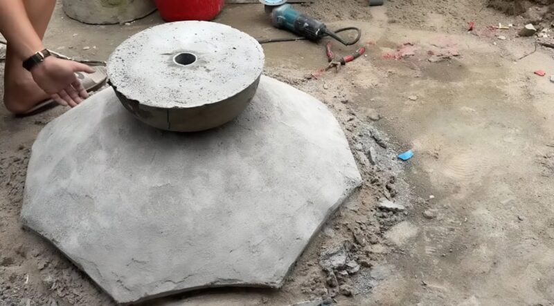 Miután mindkét rész teljesen megszáradt, óvatosan vedd ki őket a formákból. Kösd össze az alapot és az ernyőt cementkeverékkel, mint „ragasztóval”. Hagyd teljesen megszilárdulni az építményt.