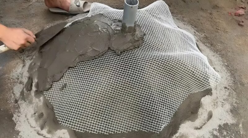 Készíts egy folyékony keveréket cementből és vízből, és jól keverd össze, amíg sima állagot nem kapsz. Még ne adj hozzá homokot! Gondosan öntsd rá ezt a keveréket az ernyő kupolájára, oszlasd el egyenletes rétegben, és hagyd, hogy egy kicsit megszilárduljon.